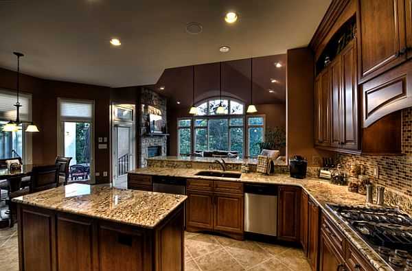 Если же вы обладатель большой кухни в частном доме — у вас есть замечательная возможность разместить все необходимое и оставить максимум свободного пространства. Важно лишь правильно расположить мебель, чтобы хозяйке было легко готовить еду и кухонные хлопоты не отнимали много времени. Так, к примеру на просторной кухне можно сделать П-образную планировку, благодаря которой останется много свободного места, что всегда хорошо. Отличной идеей будет установка острова на такой кухне. На данном острове при желании можно расположить мойку, плиту и другую необходимую технику. На особенно больших кухнях иногда устанавливают не один, а целых два острова, что очень удобно для большой семьи.