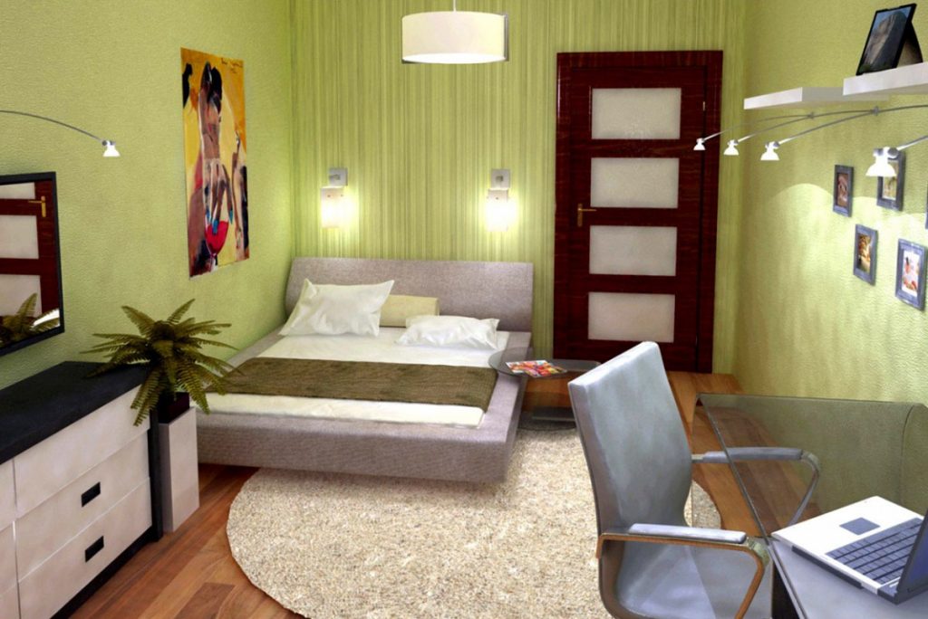 Жилое помещение небольшого размера должно стать максимально комфортным и функциональным, поэтому его рекомендуют делить на зоны. Скажем, в спальне есть смысл выделить место для сна и зону отдыха с креслами, столиком или рабочую зону, где стоит компьютерный стол. Пример зонирования на фото.