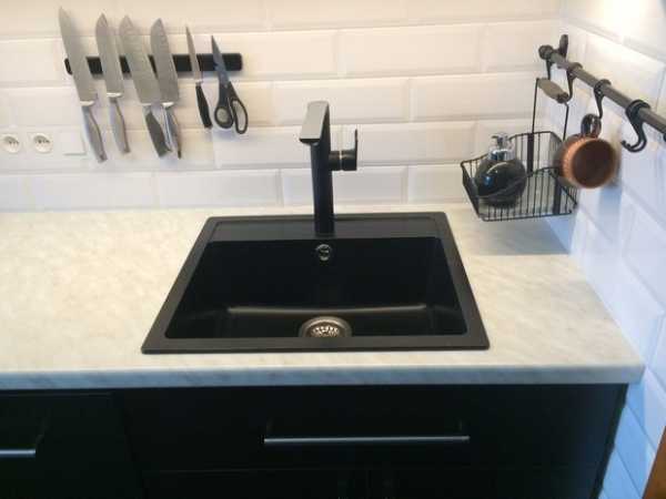Раковина — черная, из искусственного камня, очень большая и удобная (не люблю из нержавейки и с боковушками). Купили тоже в “ИКЕА”. Смеситель — черный.