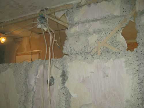 Ускорить процесс позволяет также смачивание обоев и шпаклевки водой.В это же время производят снос перегородок, стен и тому подобные работы. Перед тем, как сносится стена, из нее перфоратором выштрабливают все провода, розетки, выключатели, если они нужны; в противном случае — провода заранее отключают от электричества и убирают. Если внутри стены нужно сделать проем, то сначала отмечают границы проема, после чего перфоратором и буром (обычно диаметром на 8 -12) высверливают отверстия по этим границам. Затем бетон между отверстий раздалбливается перфоратором (насадка пика или лопатка), после чего кувалдой выносим проем.