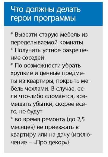 Программ, делающих ремонт, на ТВ шесть. «Мой район» выяснил, как стать героем такой передачи. «Каждый день на проект приходит несколько заявок, — рассказывает Ольга Савченко, главный дизайнер «Школы ремонта» на ТНТ. — Многие обладатели однокомнатных квартир подходят. Программа выезжает на квартиры от 65 квадратных метров». Но если даже квартира подходит, не факт, что заявку отберут — надо еще пройти кастинг. На кастинге на камеру просят рассказать о себе, о квартире, о причинах участия и пожеланиях к ремонту. Многие нервничают, их заявку бракуют. Для Андрея Белковского кастинг прошел легко. Главное — настроиться на доброжелательный лад. Белковские рассказали, что в 2009 году у них родилась дочь. Врачи порекомендовали им чаще бывать на свежем воздухе. Но в дачном доме, которому 60 лет, давно не было ремонта. Андрей решил подать заявку на «Дачный ответ». Следующий этап отбора — согласование проекта ремонта с дизайнером. Он должен осмотреть жилье и решить, сможет ли он придумать что‑то интересное, что понравилось бы и участникам. Иногда кандидатов отсеивают на этом этапе. Съемки, в которых нужно участвовать хозяевам, проходят два полных дня. В начале снимают, как они проводят в доме время, в конце — как они реагируют на изменения. Многие эпизоды снимают несколько раз. Единственный момент, который действительно снимают единожды и с первого дубля, — первый заход в комнату. «Восхищаться не заставляют, — рассказывает Белковский. — Просто перед входом проводят инструктаж о том, какие слова лучше не употреблять». Окончательный ремонт нравится не всем. «После их ремонта мы сделали собственный», — рассказывает Анастасия Трофимова, которой в 2006 году «Школа ремонта» переделывала детскую. Некоторые части интерьера отваливались, стены были не докрашены. У Белковских тоже не все было гладко. У них укоротили и неправильно приварили батарею, появилась протечка. Хозяева заметили это только через три месяца. «Несмотря на это, я считаю участие в программе подарком судьбы, — говорит Андрей. — Жаловаться, когда тебе сделали бесплатный ремонт, некрасиво». ОБЩИЕ ТРЕБОВАНИЯ Не менее трех жилых комнат в квартире или доме. Исключение — программа «Чистая работа». Грузовой лифт (если квартира не на первом этаже). Электричество, холодная и горячая вода, рабочая сантехника. Сидячие места для всех рабочих и членов съемочной группы (15‑30 человек). Если не хватает, то нужно довезти стулья. Площадь жилой комнаты должна быть не меньше 14 квадратных метров, кухни — от 9 квадратных метров. Комната, в которой просят сделать ремонт, должна быть обжитой. ТРЕБОВАНИЯ В РАЗНЫХ ПЕРЕДАЧАХ:Квартирный вопрос, НТВ Что делают: капитальный ремонт в квартире. Сколько длится: 2-2,5 месяца. Требования к дому: в пределах 40 километров от МКАД, желательно новостройка