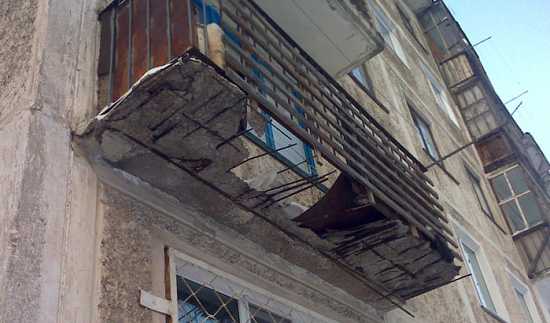 Балкон в аварийном состоянии, если: разрушена арматура, бетон распадается на куски. Тело плиты может быть разрушено на 50-90%.