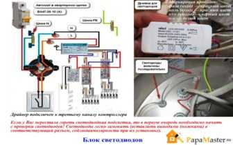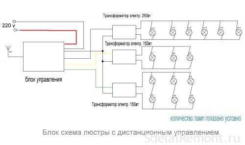 Схема такой люстры, в которой установлены галогенные лампы и светодиоды показана на фотографии. Как вы поняли, в люстрах возможны любые комбинации источников света и, вооружившись знаниями можно браться за самостоятельный ремонт люстры с дистанционным управлением.
