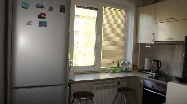 - установить холодильник в углу возле окна, рядом с варочной поверхностью.
