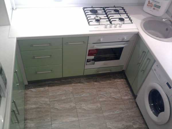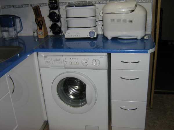 При размещении стиральной машины выбор также не велик. Скорее всего, она займет место одного из напольных шкафов. Чтобы избежать проблем с прокладкой коммуникаций, а затем с расположением дополнительных шлангов и труб, ставить ее целесообразно возле мойки. Если на кухне нет духовки, а установлена компактная варочная поверхность, то стиральную машину можно установить под нее.