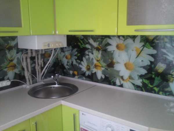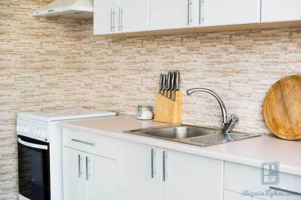 При этом будьте очень аккуратны с выбором фартука на рабочую поверхность. Не стоит выбирать нечто очень пёстрое и яркое, потому что стены белые. За счёт того, что площадь мала, этот небольшой отрезок, визуально, будет занимать существенную часть комнаты.