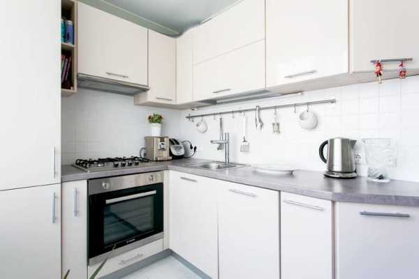 В идеале лучше использовать белый цвет. Белоснежная мебель сливается с такими же стенами, границы стираются, кухня воспринимается более просторной и легкой даже если на самом деле в ней тесновато.