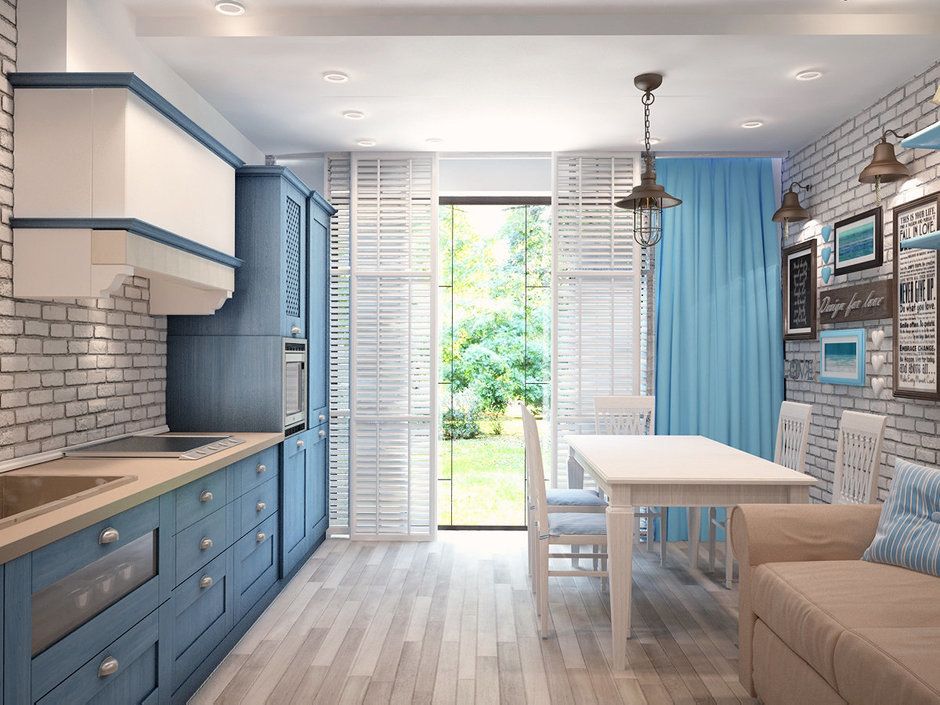 Атмосферная голубая кухня в стиле прованс с белыми фартуком и столешницей