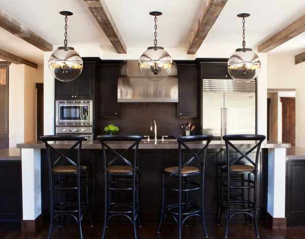 Наряду с люстрами потолок кухни оформляют точечными светильниками, поскольку света должно быть много, а освещение должно быть прямым. В случае отказа от потолочных светильников, в дополнении к центральной люстре, подбирают еще две-три, близких к ней по типу подвесных светильника.