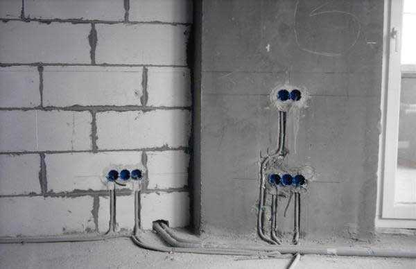 - Пока строятся перегородки, занимаетесь параллельно (или закажите) разработкой плана электропроводки. После того, как перегородки стоят, делают разводку электрики — штробление стен, прокладка кабелей (обязательно трехжильные — с заземлением, сечение проводников для электропроводки подбирают индивидуально). В зависимости от типа кабеля он прокладывается либо в гофре, либо без нее. Кабели к щитку не подключаются, розетки, выключатели не ставятся. Устанавливаются только распределительные коробки, подрозетники, в них заводятся концы кабелей. Электропроводку прокладывают:
