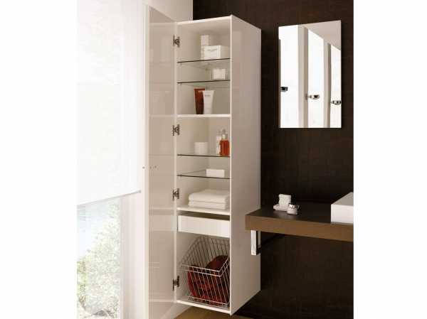 Чтобы хранить банные принадлежности используйте высокие пеналы, подвесные полки, выдвижные стеллажи.