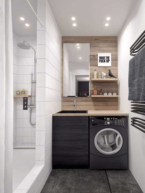 Небольшую стиральную машину с боковой загрузкой не составит труда встроить под раковину, бойлер, в углу между ванной и стеной и т.д. Нужно только установить изолированную розетку и незаметно спрятать трубы. Слив грязной воды стоит вывести напрямую в канализационное отверстие.