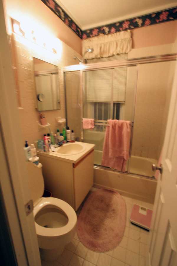 После того как помещение просохло, Лиз начала планировать дальнейшие действия. Соседи возместили ей ущерб, но этих средств было недостаточно даже для самого простого ремонта. На фото мы видим ванную комнату до коммунальной аварии.