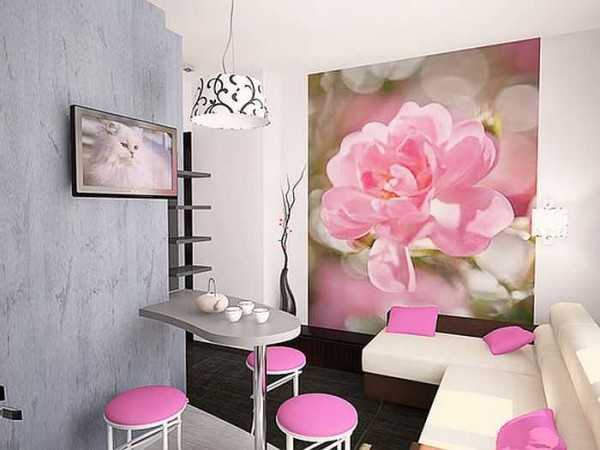 Чтобы розовые табуретки не выглядели слишком вызывающе, на стене наклеены фотообои. Они гармонизируют весь интерьер.