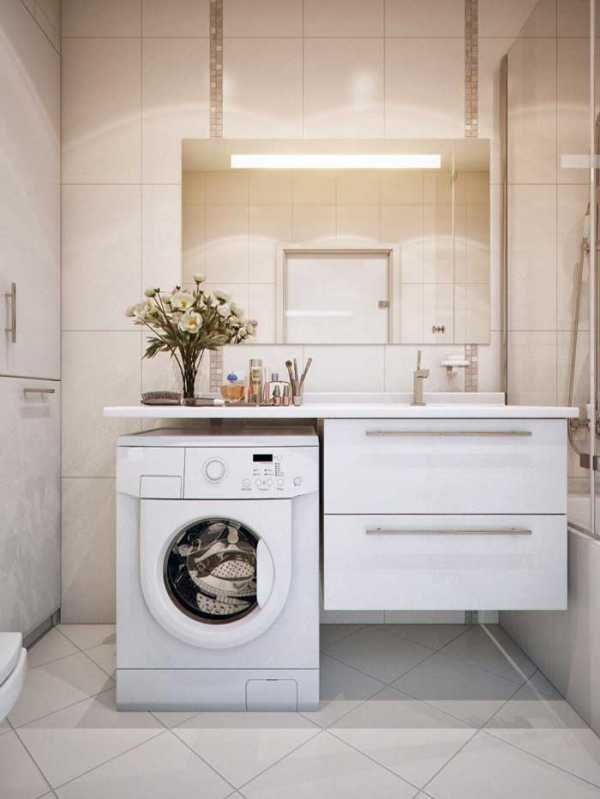 Рационально распределенное пространство ванно-туалетной комнаты, позволило установить в ней стиральную машину, органично вписанную под туалетный столик.