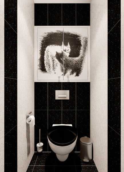 И на десерт самое сладкое — котики. Вернее, их симпатичные изображения на задней стене этой миниатюрной туалетной комнаты. Классическое сочетание черного с белым. Дизайн туалета на фото отличается заметным креном в сторону минималистичного модерна.Впрочем, оставим сложные термины художникам, а сами лучше просто молча насладимся отличным дизайнерским решением.