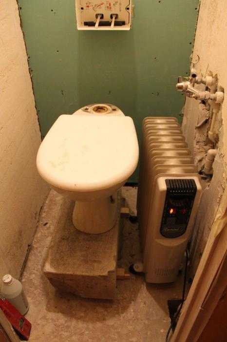 Здесь уже зашита гипсокартоном инсталляция. Вот такая временная конструкция унитаза…. Обогревателем пытались ускорить процесс просушки стен.