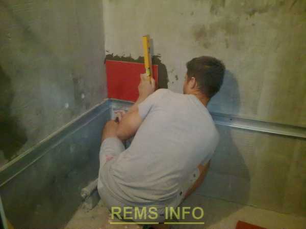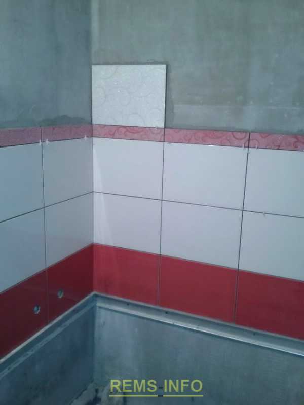 — подготавливаем пол и стены к укладке кафельной плитки, если перепад высот на полу большой необходимо предварительно выровнять поверхность при помощи наливного пола, или другим способом. Так как в помещении ванны большая вероятность протечки воды – рекомендуется сделать гидроизоляцию. Стены также выравниваем — если есть бугры – их сбиваем. Чем качественней будет сделана эта работа, тем легче будет укладывать плитку, соответственно потребуется меньше самого клея.