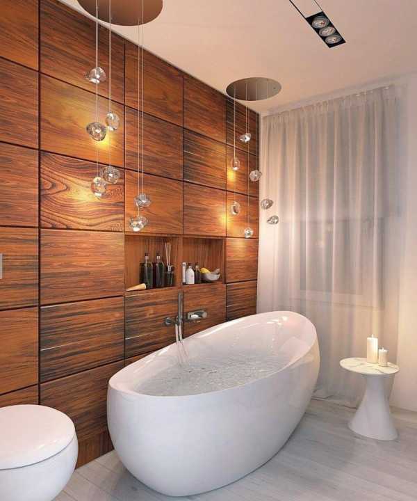 В этом году модно устанавливать прямоугольные ванны, отделанные снаружи деревом или материалами под древесину. Их встраивают в подиум, и они могут быть на всю длину стены.