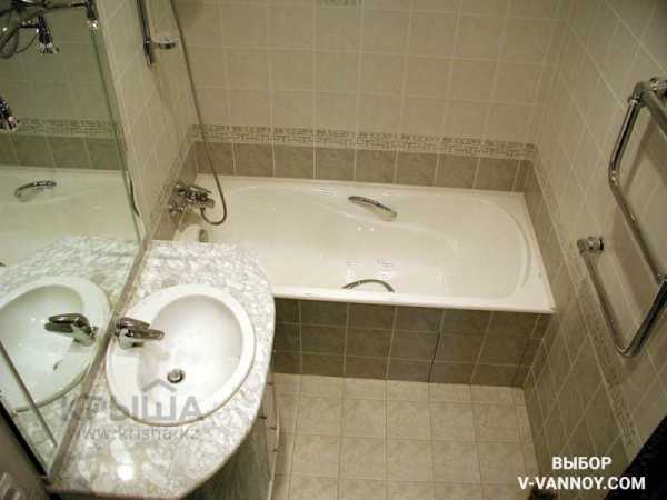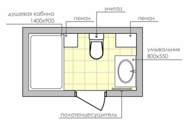 В случае нахождения двери в длинной стене ванну можно выбрать угловую либо так же разместить ее вдоль узкой стены.