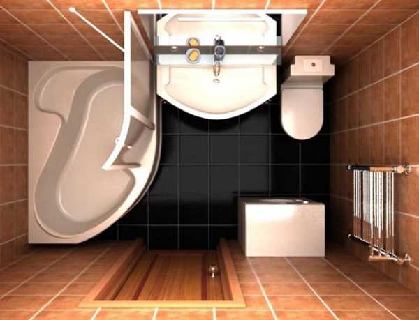 2 | Угловое | В угол устанавливается душевая кабина или небольшая ванна. А напротив входа вполне свободно можно разместить унитаз и раковину. При таком варианте расположения мебели останется место для миниатюрного шкафа или компактной стиральной машины. |