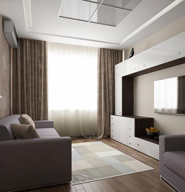 Учитывая минимальное количество помещений, гостиная в двухкомнатной квартире одновременно может использоваться также в качестве дополнительной спальни, рабочего кабинета, а иногда и столовой. В ее дизайне необходимо соблюдать баланс оттенков и линий. Рекомендуется избегать резких контрастов и чересчур ярких решений, а выраженную горизонталь мягкой мебели уравновешивать вертикальными складками штор.