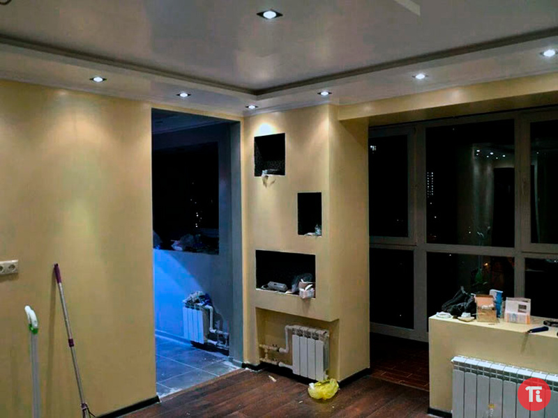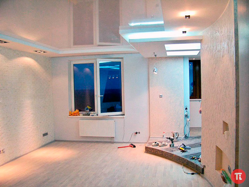 Демонтаж перегородок и старых отделочных материалов. Проектирование и монтаж электропроводки, замена труб водоснабжения и канализации. Общестроительные работы и подготовка поверхностей к чистовой отделке. Монтаж двухуровнего подвесного потолка ГКЛ с точечными светильниками. Отделка ванны и туалета, а также укладка плитки ПВХ и керамогранита, установка межкомнатных дверей и другие работы.
