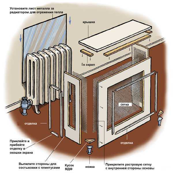 Второй вариант решетки для радиатора — на приставном коробе. Его каркас изготавливают или из древесины, или из ДСП. Лицевая панель изготавливается по тому же принципу, что и описанный выше вариант. Собственно, на схеме все понятно: и порядок сборки и основные этапы изготовления. Что вам нужно — самостоятельно определиться с размерами.