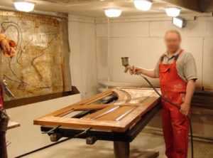 - Чтобы отреставрировать изделие, покрытое лаком, удаляют старый слой лака до древесины. Шлифуют мелкой наждачной бумагой по направлению волокон дерева. Новый лак наносят поролоном или используют флейцевую щётку. Первыми двумя слоями покрывают с интервалом 3 часа. Третье и четвёртое окрашивание выполняют через сутки. Всего наносят 4 слоя. После высыхания изделие полируют войлоком.