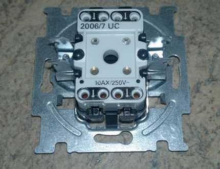 Клеммник выключателя, но уже не из группы тех приборов, которые предназначены под коммутацию в режиме реверсивного переключения. Это внешний вид задней стенки проходного выключателя, где не более 3 рабочих контактов
