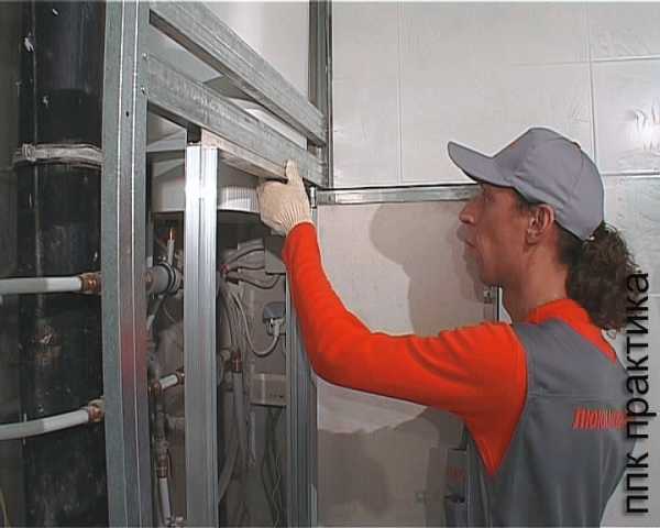 1. При помощи лазерного уровня размечаем стену и начинаем собирать каркас, используя перегородочные профили 50 мм, оставляя окошко по размеру ревизионного люка.