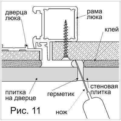 Потом люк открывается руками, подковырнув дверцу шпателем. Обязательно следите за тем, чтобы во время облицовки клей не попадал в щели!