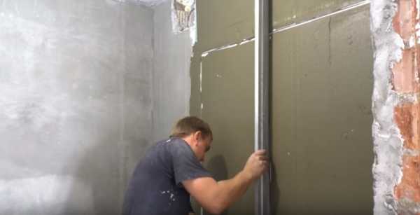 4. Для того чтобы сровнять гипсокартон со стеной, проходим стену клеем для плитки при помощи длинного правило.