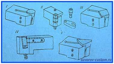 Под номером I и II показано крепление твёрдосплавных пластинок цилиндрической формы, а под номером III показано закрепление квадратной пластинки, под номером IV показана закреплённая пластинка прямоугольной формы, ну и под номером V показан пример закреплённой треугольной пластинки.
