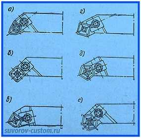 Ну и пятигранные и шестигранные пластинки применяют для проходных резцов с углами φ=60º (под буквой д) и с углами φ45º — показано под буквой е.