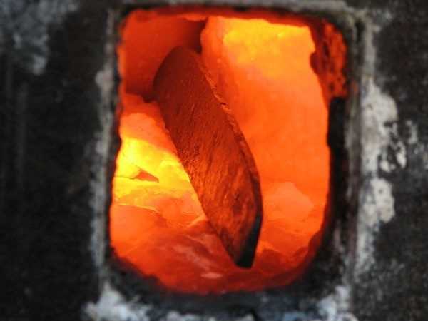 Когда заготовку согнули до требуемой формы, необходимо провести предварительную заточку кромки. На следующем этапе рабочая часть подвергается закаливанию. Это делается с помощью разогревания острия на отрытом огне, например газовой горелкой или в кузнечном горне. Далее обеспечиваем резкое охлаждение в большом объеме машинного масла.