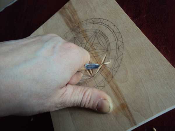 Сделав одну линию или надрезку, делаем следующую. Только теперь наклон лезвия должен быть в противоположную сторону. Отделится стружка, а на доске появится углубление геометрической формы. Если края четкие, а поверхность блестит, значит, все было сделано правильно. Постепенно вырезаем весь элемент, а потом и полностью орнамент.