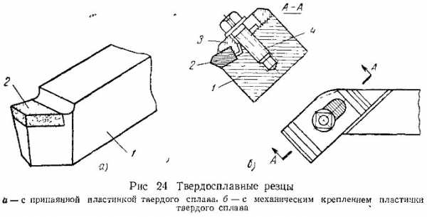На рис. 24, а показан такой резец; к стержню 1, изготовленому из конструкционной углеродистой стали, припаяна электролитической красной медью пластинка 2 твердого сплава. Такие резцы просты в изготовлении, но имеют ряд недостатков. Одним из недостатков такого метода крепления твердосплавной пластинки является образование после напайки мелких трещин в пластинке. Эти трещины снижают прочность пластин и приводят их к выкрашиванию во время работы.