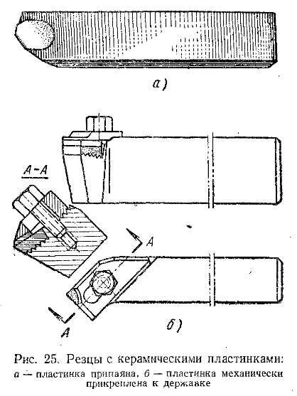 Керамические пластинки, как и твердосплавные, обычно припаивают к стержным резцов (рис. 25, а) или креят механически (рим. 25, б).