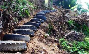 Легкий вес, простота обработки и пластичность автомобильных шин обуславливают простоту их мощения. Поэтому добиться отличного результата работы в своем саду смогут даже начинающие застройщики, опыт в строительстве которых ограничен просмотром тематических мастер-классов в сети. Воспользовавшись подсказками, приведенными в текущем разделе, собственники дачи смогут в кратчайшие сроки составить маршрут троп на проблемном рельефе и аккуратно вымостить их поверхность.