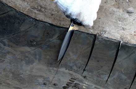 Нужно прикладывать определённые усилия, чтобы прорезать несколько лент из шины. Чтобы лезвие легче скользило по резине, его стоит заранее смазать в мыльном растворе.