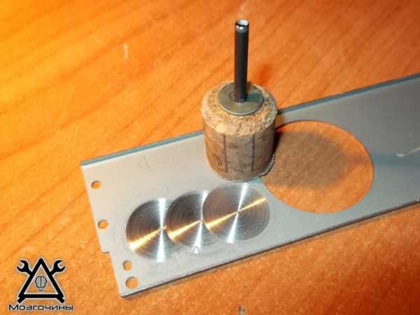 По центру заготовок делаются отверстия, они нанизываются на винт, и затем зажимаются гайкой. Готовое приспособление вставляется в патрон дрели.