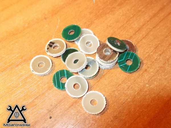Как и в предыдущем случае, нам понадобится винт, шайбы и гайка, только вместо наждачной шкурки будет использован войлок. Разметив кусок войлока, вырежем из него кружки одинакового радиуса.