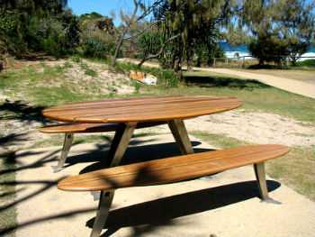 Столики, опорой которой опять же служит резная фигура. Большие столы, удачно сочетающие столярную часть и фигурную резную составляю, за которыми на свежем воздухе так приятно собираться всей семьёй.