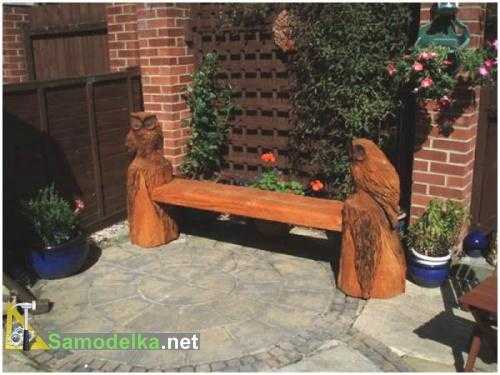 - Украсить деревянную скамейку можно вырезанными скульптурами или разными необычными деталями, например, спинкой из неровных веток.