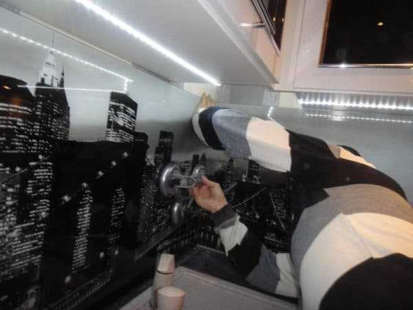 Светодиодная лента добавит нотку креатива в интерьер. Устанавливать ее нужно по краю скинали. Между лентой и художественными триплексами должно быть расстояние 3 см.