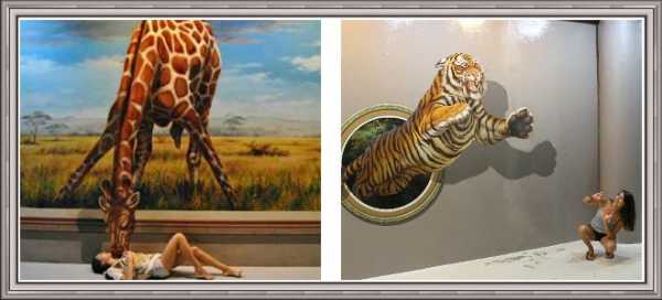 Людям очень нравятся 3д рисунки своей необычностью. Допустим, стена, лист бумаги или асфальт находится под углом к зрители, а изображение на этой стене сделано таким образом, что оно кажется без искажений, но такой эффект только с одной точки.
