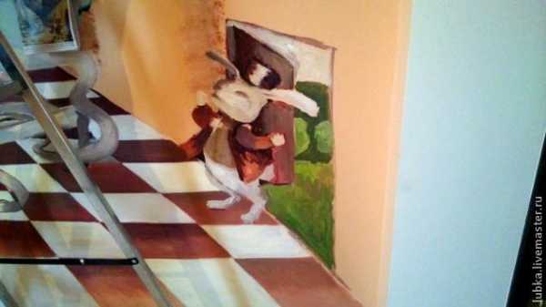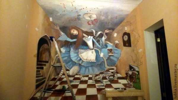 Начинаем раскрашивать и заниматься деталями. Очень эффектно, когда пару деталей из изображения попадают на соседние стены. Так как стены нарисованного коридора у нас такие же как и в комнате, можно использовать по краям ту же краску, в которую покрашены сами стены.