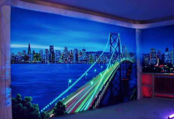 Флуоресцентные 3d стены в квартире покрыты специальным фосфоросодержащим составом, который проявляется исключительно в вечернее и ночное время дня. Изображение дублирует основную нарисованную на обоях картинку. Светящаяся краска не дает трехмерного эффекта, она может использоваться также для обработки обычных обоев.