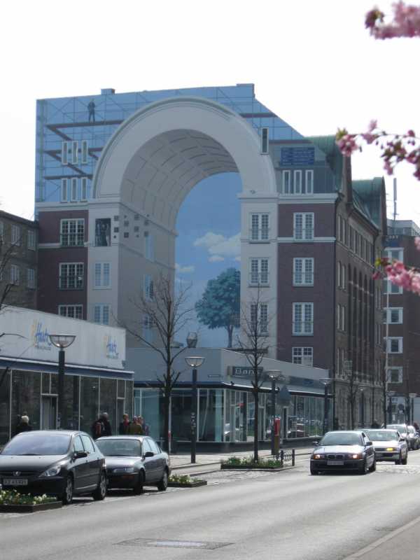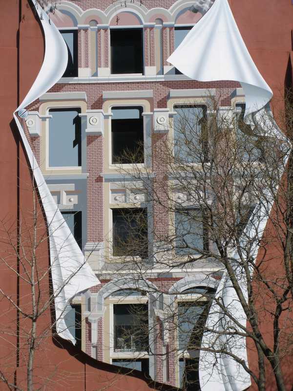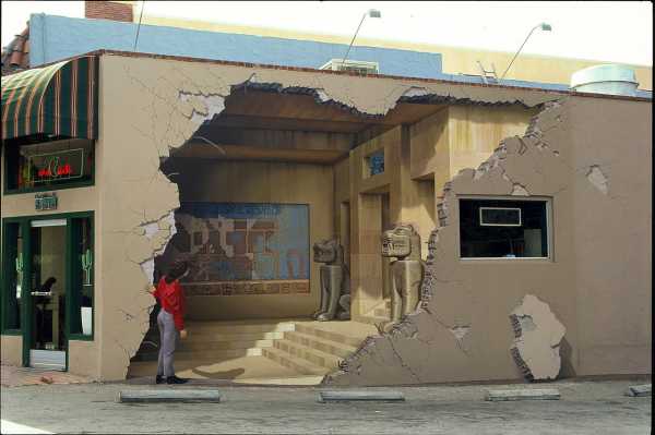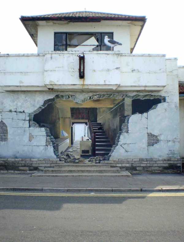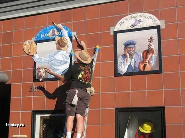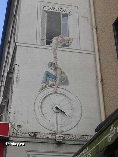 На самом деле здесь нет никакой скульптуры, кирпичной кладки, девушки и прочего, все это нарисовано на стене здания американским художником Джоном Пью (John Pugh), специализирующемся на искусстве «trompe l’oeil» или «обман зрения».